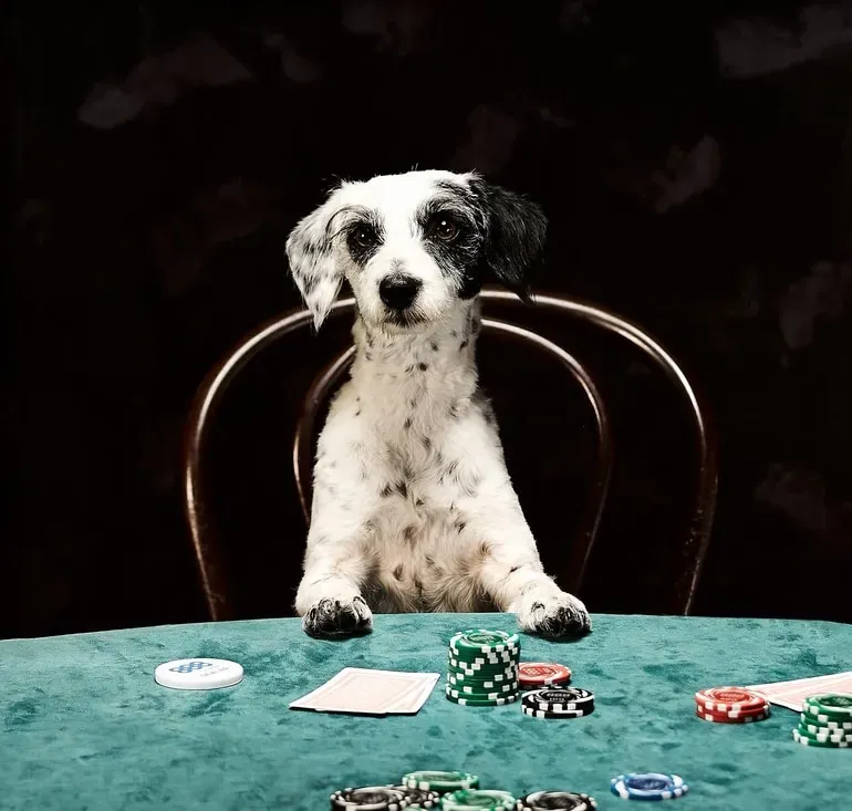 Six dogs sit around a circular poker table in a dimly-lit room. A bulldog puffs on a cigar as the pooch studies a Saint Bernard opponent. A pile of chips is in the middle of the table as the Saint Bernard sits slightly back from the table, giving no sign as to whether he’s bluffing or has the nuts.